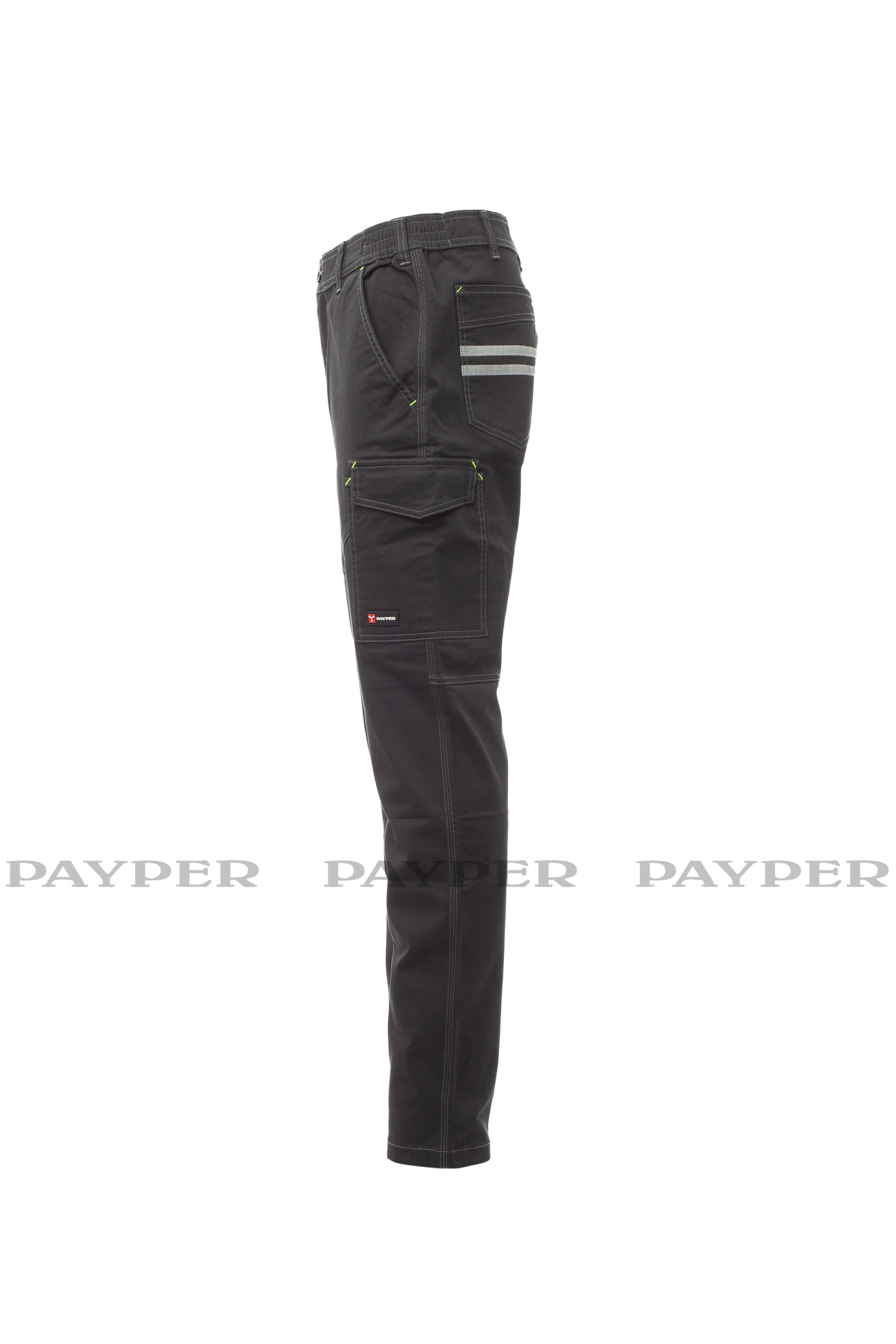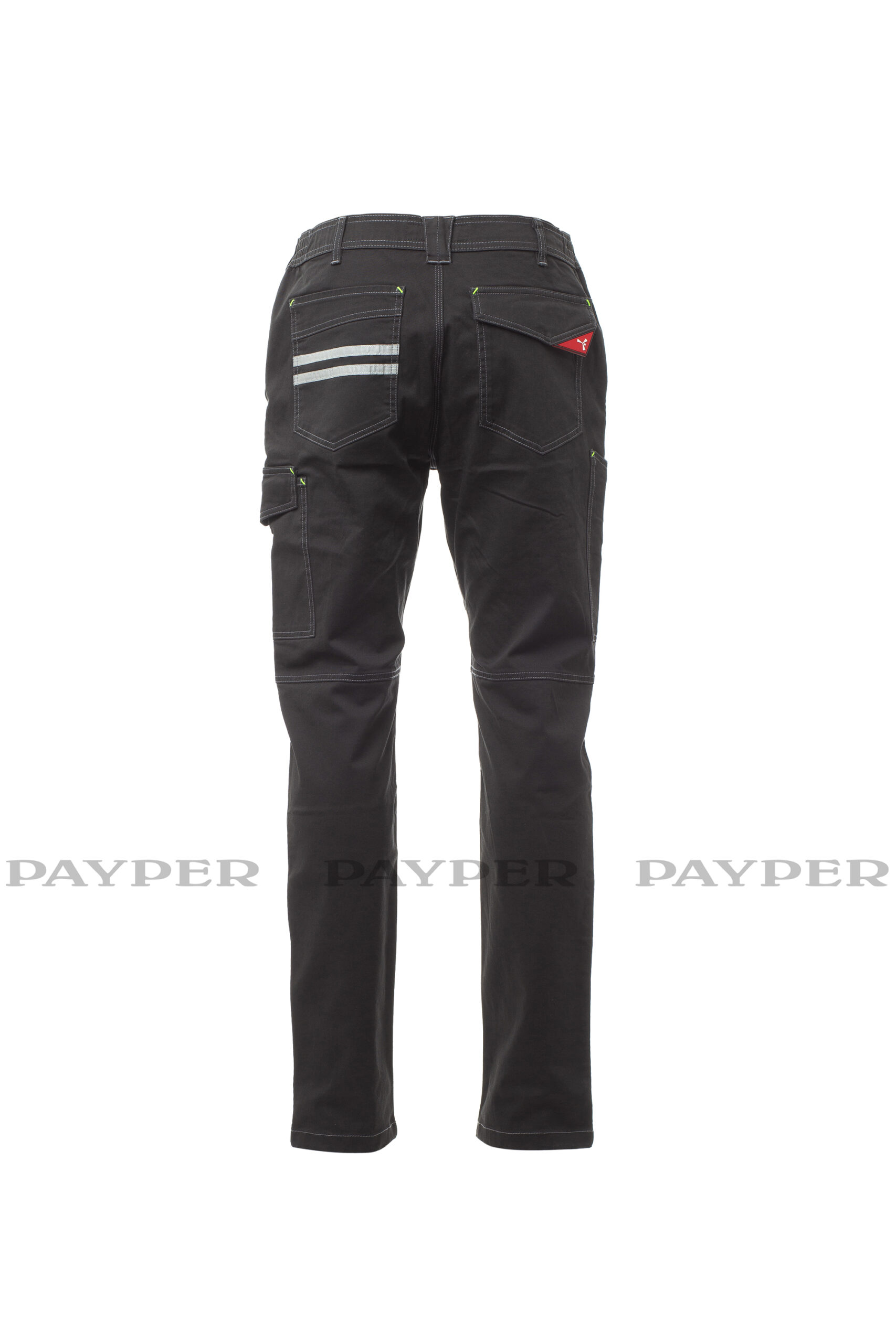Pantalón unisex, elástico, multiestación, con elásticos laterales y trabillas en la cintura, cierre con cremallera y botón de plástico, dos bolsillos delanteros de corte clásico, un bolsillo lateral con LOCK SYSTEM, un soporte para metro; dos bolsillos traseros, uno con tapeta y velcro y otro abierto, costuras de la entrepierna e interior de la pierna con triple aguja. Aplicaciones y pespuntes en contraste, bandas reflectantes en el bolsillo trasero, costura triple. Botón con remache para el color blanco.